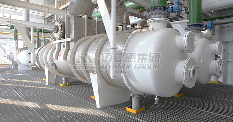 邁安德浸出器冷凝器主要用于植物油浸出車間,冷凝浸出器內部揮發出的溶劑及進料帶進的空氣、水蒸氣等二次蒸汽,保持系統微負壓,該設備屬于管殼式換熱器。